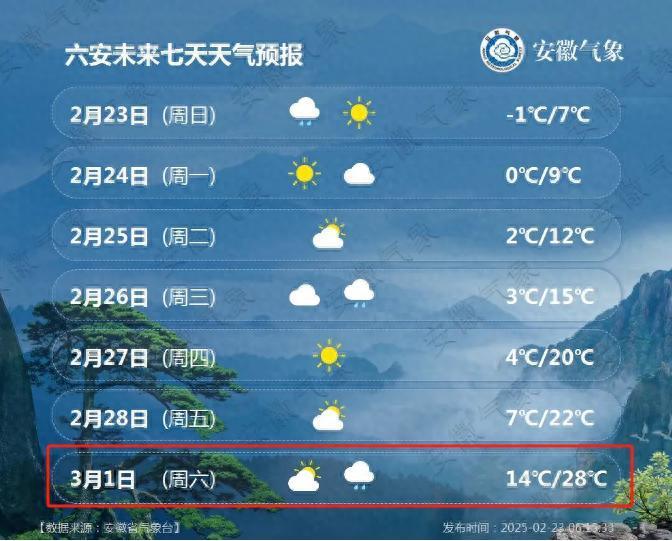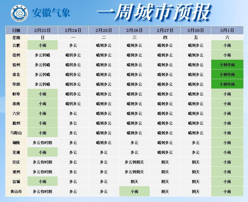 ▼ 未来一周全省具体预报24日(周一):淮北地区晴天转多云;淮河以南多云有时阴天。25日(周二):江北晴天到多云;江南多云到阴天。26日(周三):江北晴天到多云;江南多云到阴天,南部地区有小雨。27日至28日(周四至周五):江北晴天到多云,江南多云到阴天。3月1日(周六):全省多云转阴天有小雨,其中江北部分地区中雨。▼ 未来一周城市天气预报